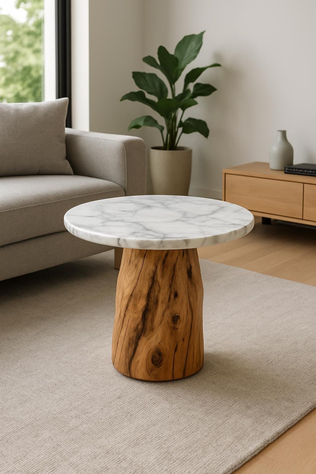 Handmade Calacatta Marble Side Table – Modern Boho Farmhouse Minimalist Accent Table, Natural Wood Base