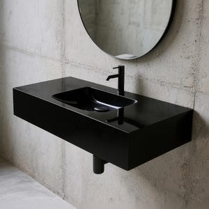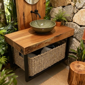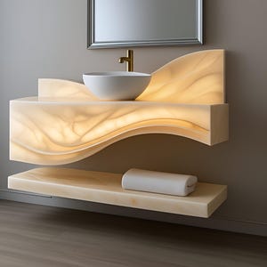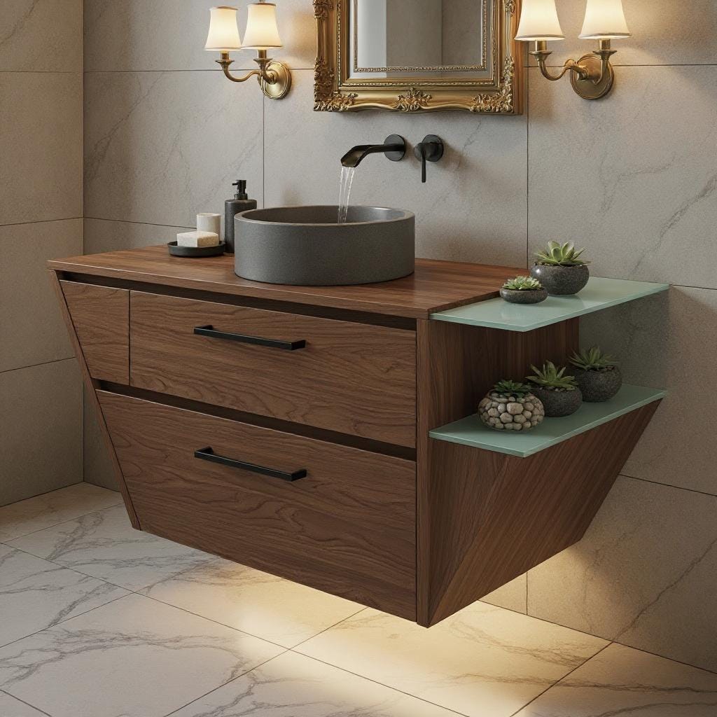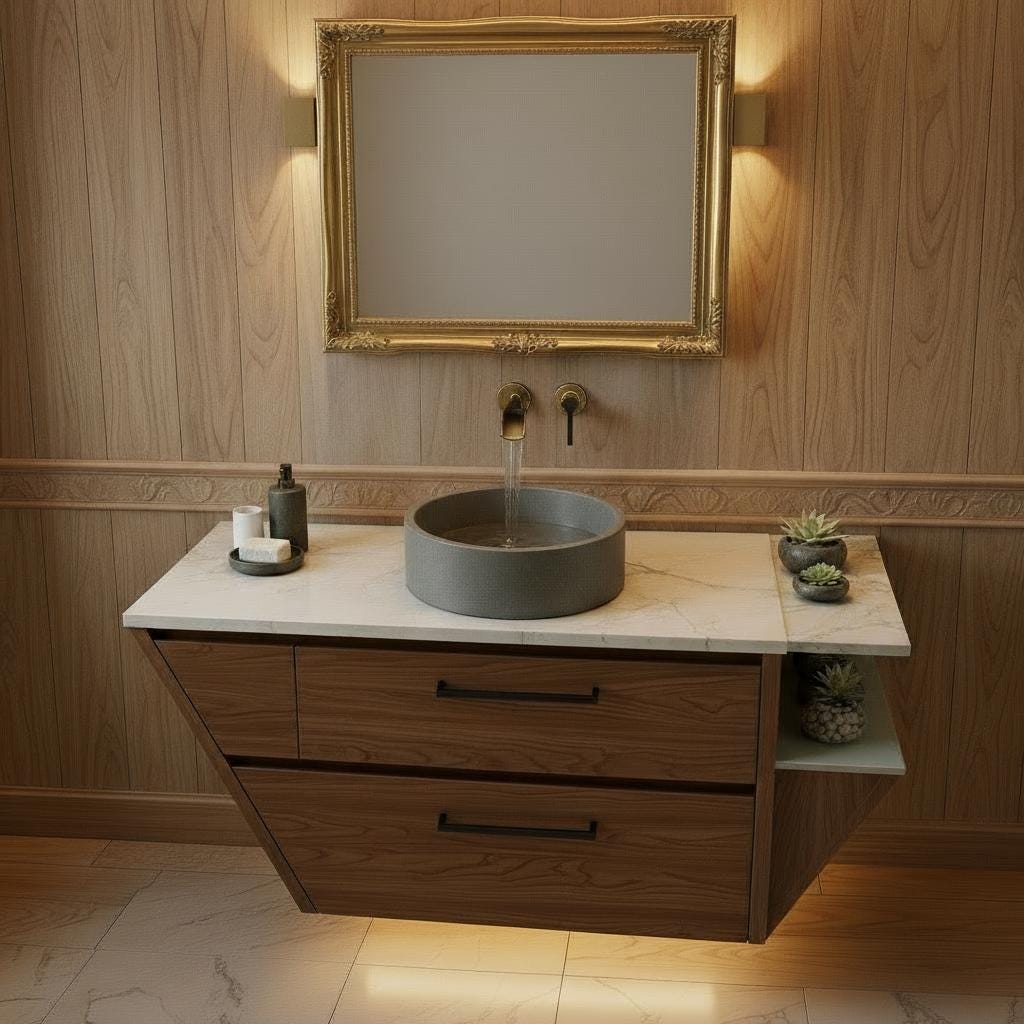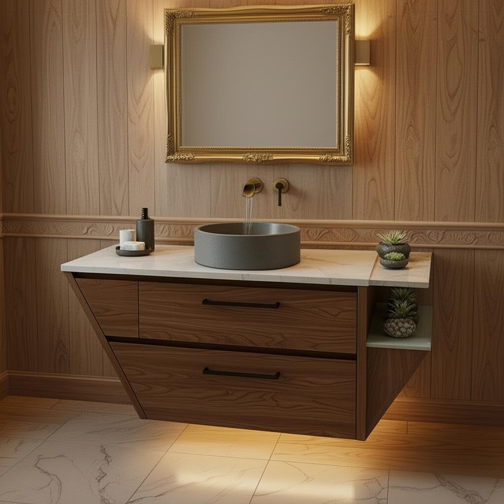Introduce warm, modern craftsmanship to your bathroom with this handmade floating vanity by Marble Aura Design. Each piece is meticulously built from solid wood, including the countertop, for a clean, cohesive, natural look that feels both modern and timeless.